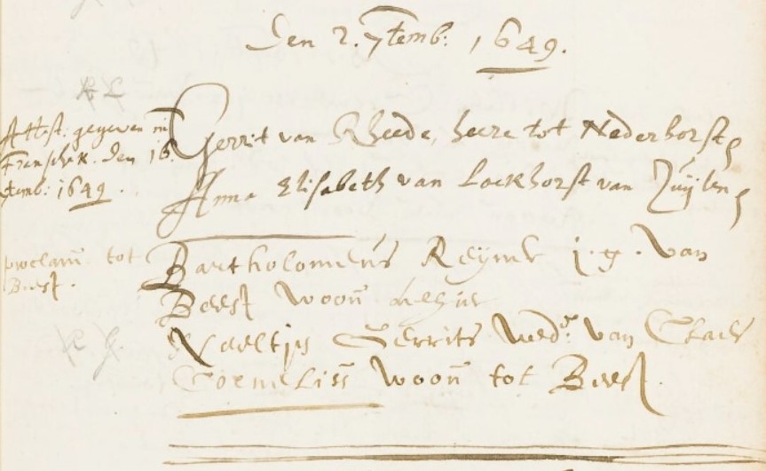 Gerard hertrouwt 23-08-1657 met zijn nicht Agnes van REEDE, dochter van Ernst van REEDE en Elisabeth van UTENHOVE.