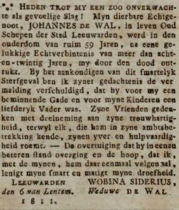 - Catharina Elisabeth de WAL, geboren Leeuwarden 22-05-1788, overleden Franeker 09-03-1844.