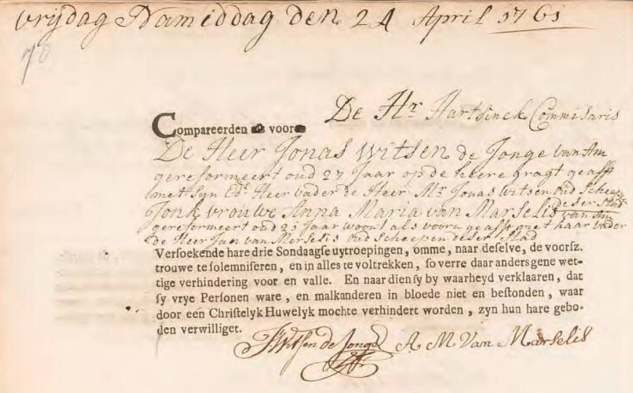 Jonas is ondertrouwd 24-04-1761 met Anna Maria van MARSELIS, gedoopt Amstelkerk Amsterdam 10-05-1739, overleden Amsterdam 26-04-1777, dochter van Jan van MARSELIS en Johanna CLIFFORD.