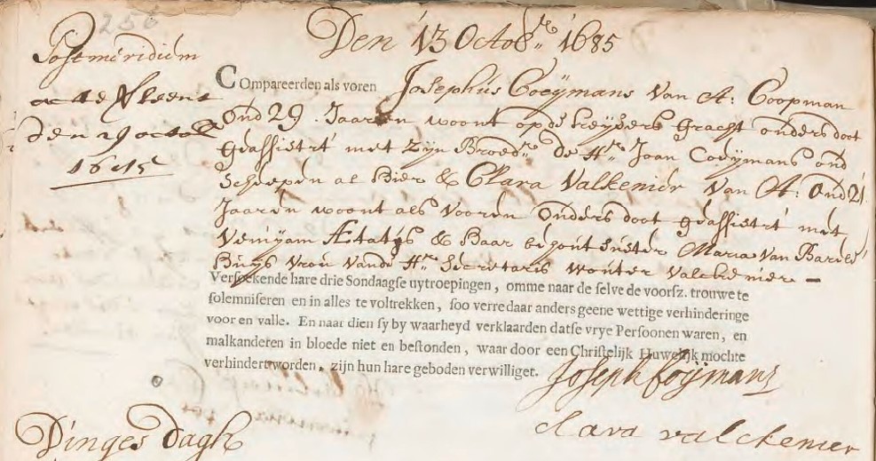 Joseph is ondertrouwd Amsterdam 13-10-1685 met Clara VALCKENIER, gedoopt Zuiderkerk Amsterdam 27-01-1664, overleden en begraven Zuiderkerk Amsterdam 24-10-1724, dochter van Gillis VALCKENIER (burgemeester van Amsterdam) en Jacoba RANST.