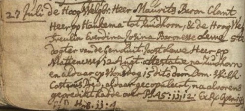 Maurits CLANT van HANCKEMA, gedoopt Groningen 30-05-1730, overleden Zuidhorn 26-05-1804, zoon van Edzardt Jacob CLANT van HANCKEMA en Swana Aldegonda GRUIJS.