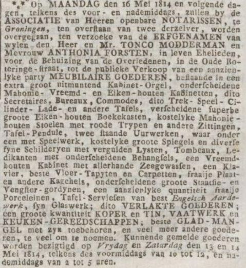 - Angelica Catharina MODDERMAN, geboren Boteringestraat Groningen, gedoopt Martinikerk Groningen 13-04-1780, overleden Hoogezand 26-07-1821.