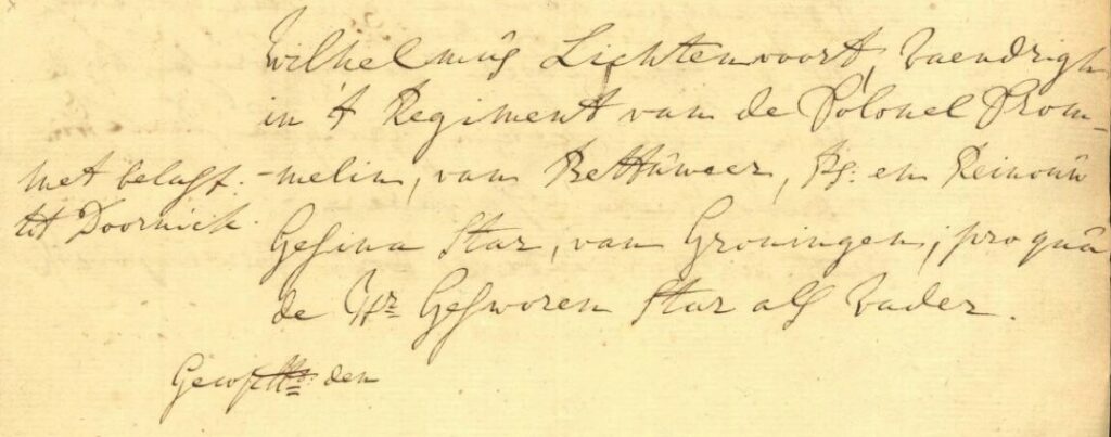 Wilhelmus LICHTENVOORT, geboren Doornik (België) 1719, overleden en begraven Groningen 27-05-1799, zoon van LICHTENVOORT en Maria LEIJHAMER.
