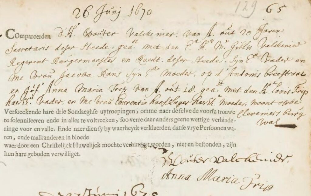 Wouter is ondertrouwd Amsterdam 16-06-1670 en getrouwd Amsterdam 15-07-1670 met Anna Maria TRIP, geboren Amsterdam 09-07-1652, overleden en begraven Wester Kerk Amsterdam 23-12-1681, dochter van Louis TRIP en Emerentia HOEFSLAGER.