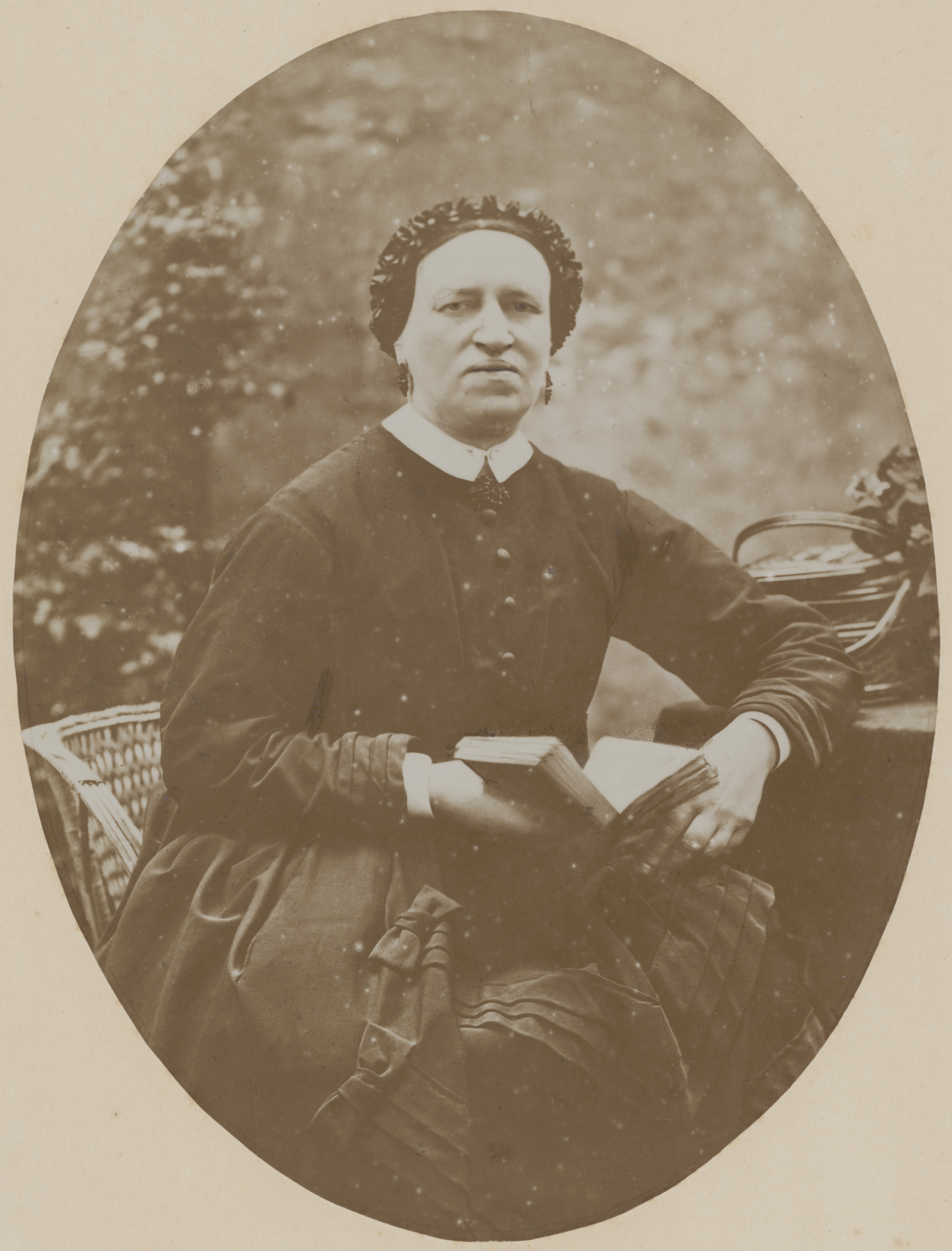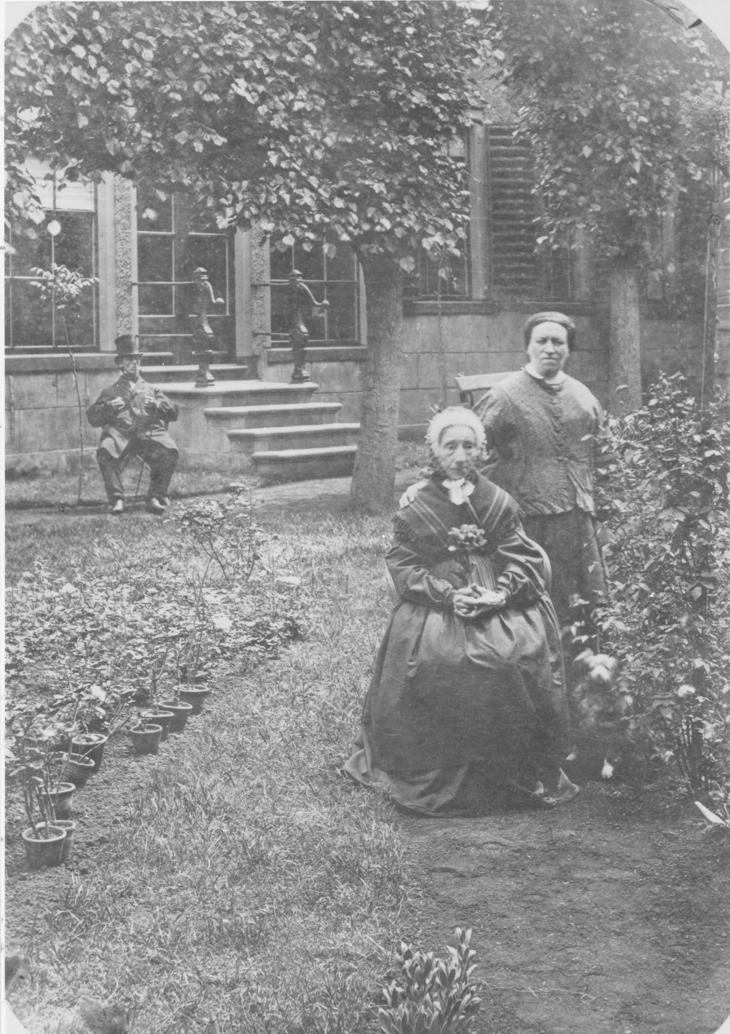 Groningen, 1875-1879, Turfsingel westzijde: Geesjen Aijolts Tonkes met haar dochter Sijbendina en zoon Tiddo Folmer (links achter) in de tuin van het Trommius-huis, waar Abraham Trommius (1633-1719) heeft gewoond.