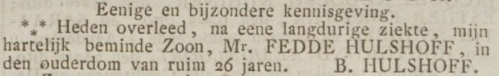 - Zoon (Martinus?) HULSHOFF, geboren Amsterdam 27-11-1822