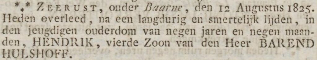 - Barend HULSHOFF, geboren wijk HH, Keizersgracht 481 Amsterdam 26-07-1808, gedoopt Kerk Lam en Toren Amsterdam, overleden en begraven Zeist 15-02-1877. Suikerraffinadeur.