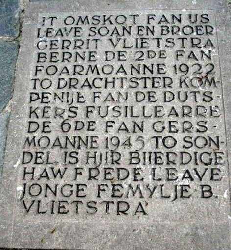 - Gerrit VLIETSTRA, geboren Drachten 02-01-1922, overleden Nijemirdum Gaasterland 06-04-1945. Agent van politie.