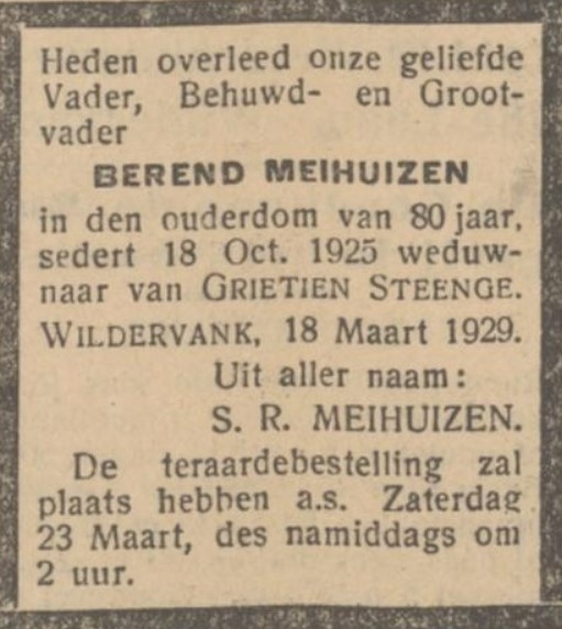 - Samuel Roelof MEIHUIZEN, geboren Borgercompagnie (Wildervank) 13-05-1874, overleden Wildervank 15-12-1953.