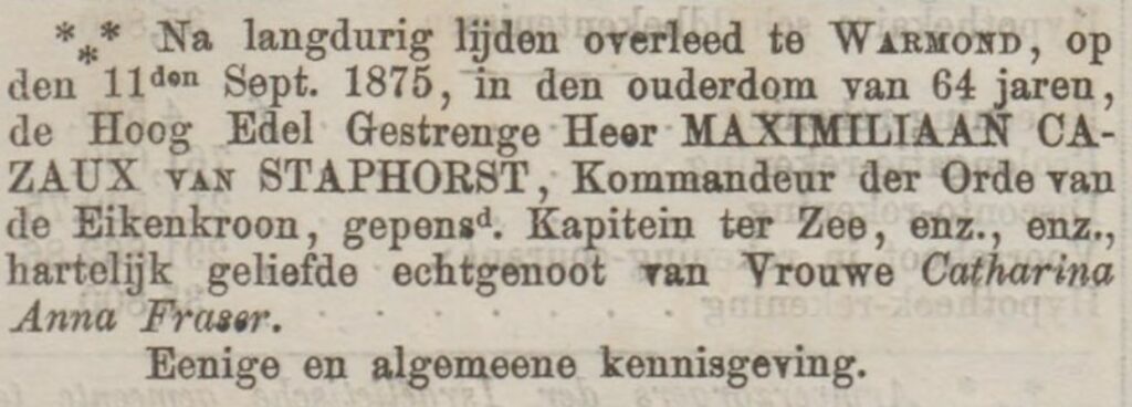 Catharina was weduwe van Maximiliaan CAZAUX van STAPHORST, geboren 1811, Kapitein ter Zee, overleden Warmond 11-09-1875.