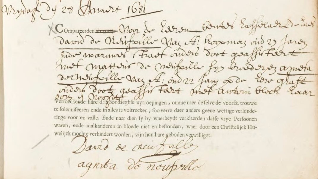 David is ondertrouwd Amsterdam 28-03-1681 en getrouwd Amsterdam 20-04-1681 met zijn nicht Agneta de NEUFVILLE, geboren 1659, overleden 1719, dochter van David de NEUFVILLE en Nelletje BLOCK.