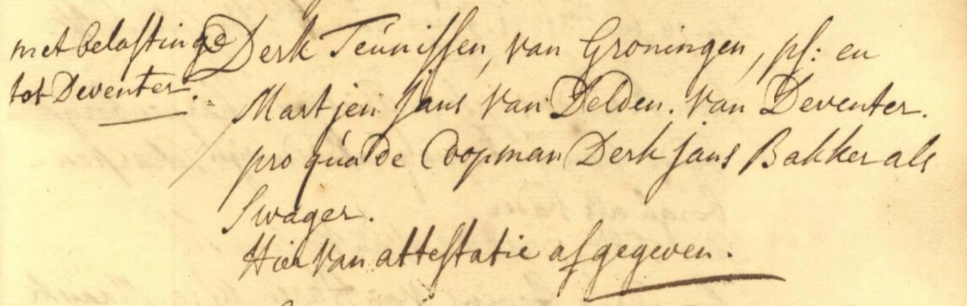 Derk is ondertrouwd (als Derk Teunissen) Groningen 30-12-1730 met Martje Jans van DELDEN, geboren De Poot Deventer 11-01-1695, overleden In de Spijkerboor (?) Groningen 02-12-1746, dochter van Jan Berends van DELDEN en Fenneke Steffens ten CATE.
