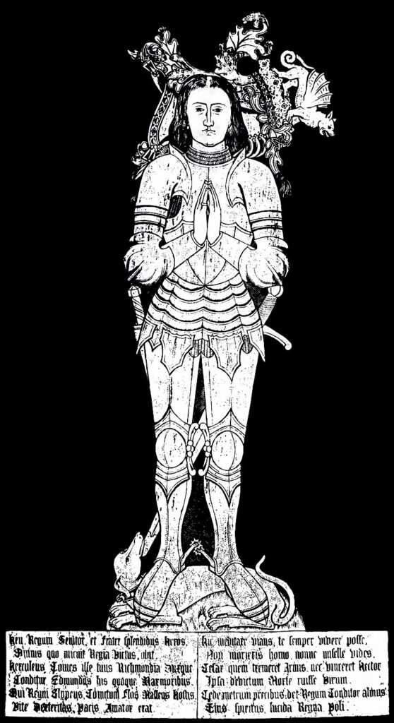 Edmund TUDOR, geboren Much Hadham, Hertfordshire (Engeland) 11-06-1430, overleden (in gevangenschap) Carmarthen, Wales (Engeland) 01-11-1456, zoon van OWEN TUDOR en Catharina van VALOIS.