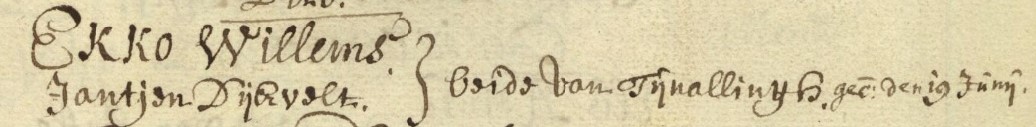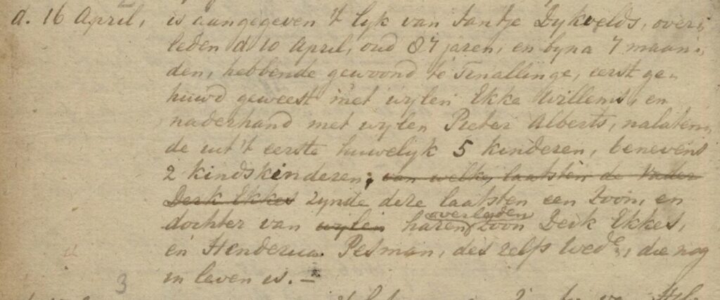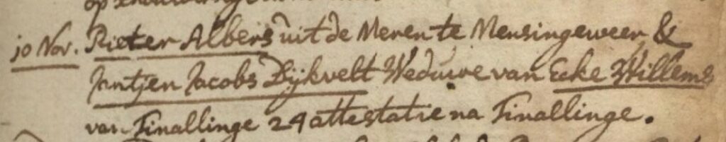 Jantje Jacobs Dijkvelt ondertrouwt Gerecht van Rasquert, Tinallinge en Den Andel 09-11-1765 en hertrouwt Kerkelijke gemeente Mensingeweer en Maarslag 10-11-1765 met Peter Alberts, van de Meren, Mensingeweer.