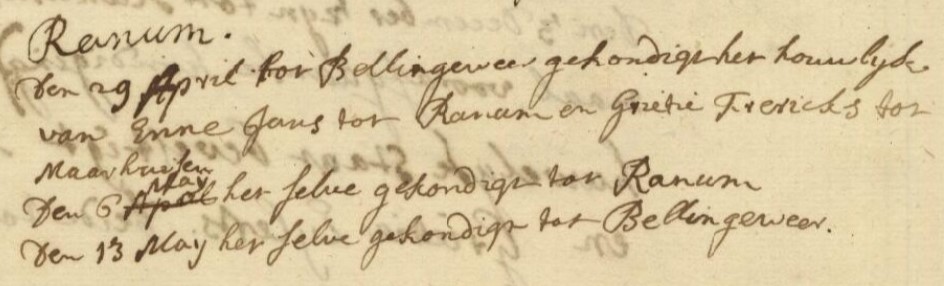 Enne is getrouwd Bellingeweer en Ranum 29-04-1759 met Grietje Freerks, geboren Maarhuizen 1736*, overleden Maarhuizen 04-04-1788*, dochter van Freerk Eijlkes en Grietje Derks*.