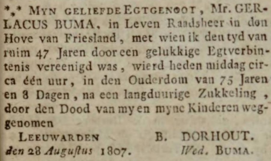Gerlacus BUMA, geboren Sneek 20-08-1732, overleden Leeuwarden 28-08-1807, zoon van Wiebe Feddes BUMA en Rebecca SELSMA.