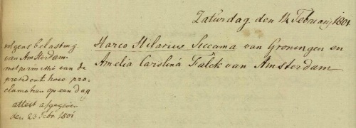 Harco is getrouwd Groningen 14-02-1801 met Amelia Caroline FALCK, geboren Utrecht 24-09-1779, overleden Utrecht 10-02-1852, dochter van Otto Willem FALCK en Engela Appolonia BERGH.