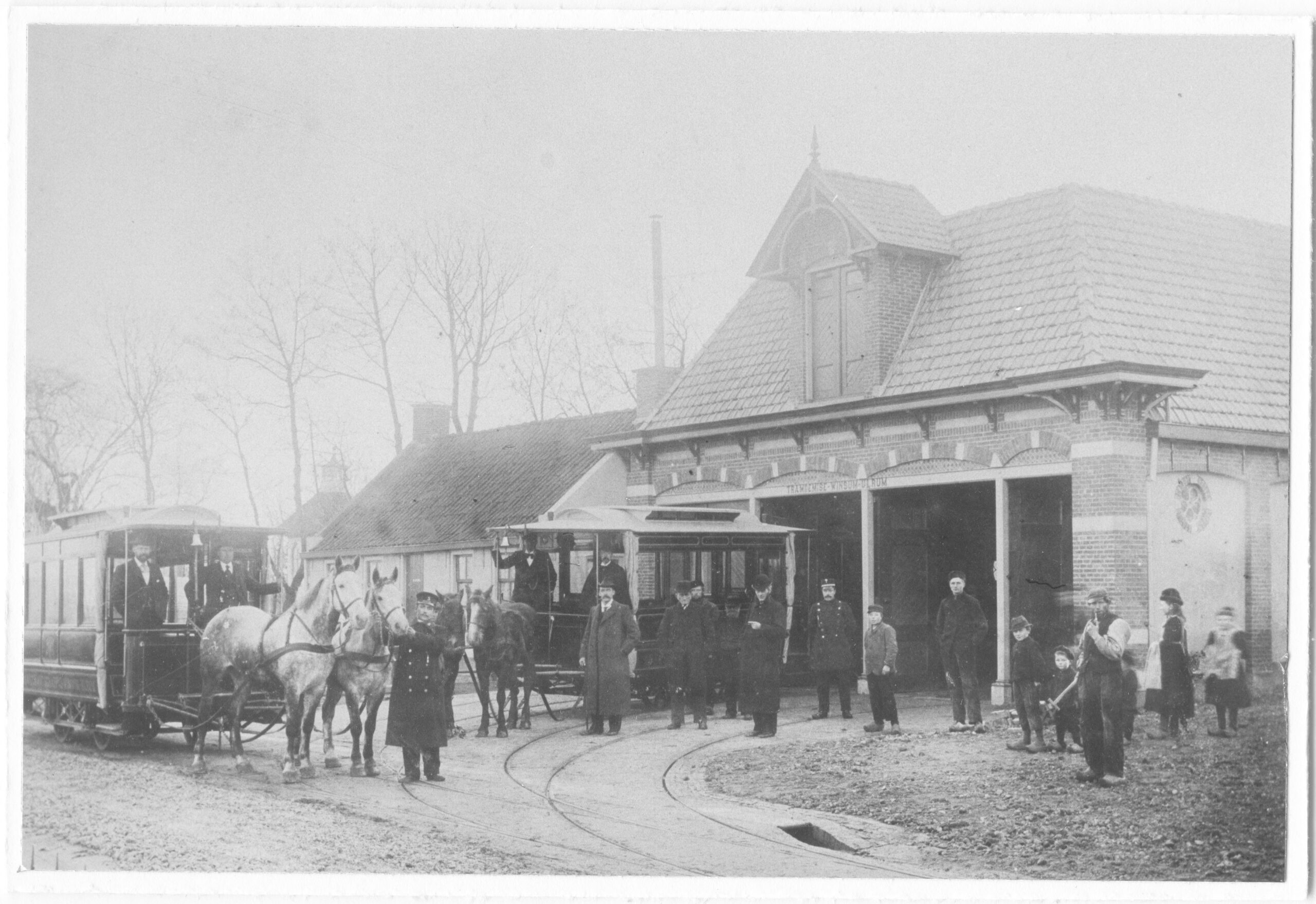Wehe-Den Hoorn : opening van de tramremise. V.l.n.r. (op de eerste tram) : Harm Knol Bruins, Wicher Wichers, direkteur tramlijn Winsum-Ulrum; G. Tinge, koetsier (op de tweede tram); burgemeester Tjarda van Starkenborg; architect Huurman.