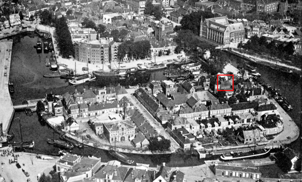 In het rode vierkant de bakkerij van Hendrik, achter het woonhuis met winkel aan de Steenhouwerskade 3.