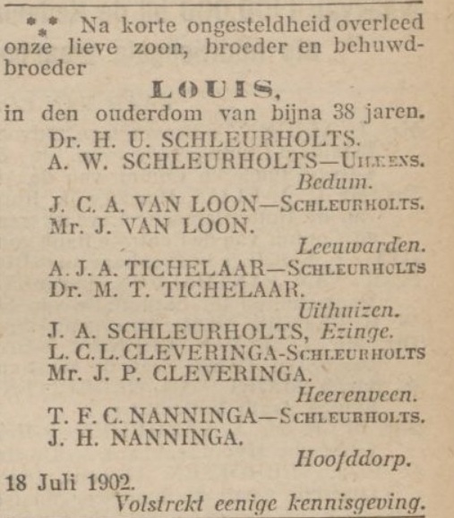 Anna en Menzo zijn begraven in Bedum. - Louis Teunis SCHLEURHOLTS, geboren Bedum 21-07-1864, overleden Bedum 18-07-1902.