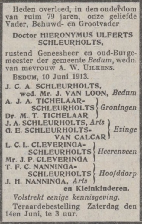 - Jacobus Albertus SCHLEURHOLTS, geboren Bedum 06-04-1866, overleden Ezinge 08-12-1927. Arts