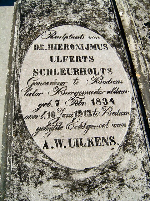 Hieronimus Ulferts SCHLEURHOLTS, geboren Bedum 07-02-1834, overleden Bedum 10-06-1913, zoon van Luitjen Tonnis SCHLEURHOLTS (medicinae doctor) en Johanna Catharina SONIUS.