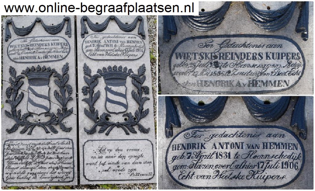 Hindrik Antonie van HEMMEN, geboren Hoornsche Dijk (Haren) 07-04-1831, overleden Zuidwolde (Bedum) 17-07-1906, zoon van Antonie van HEMMEN en Geesje Louwes BOLHUIS.