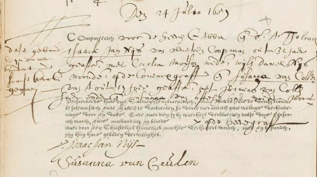 Isaac ondertrouwt Amsterdam 24-07-1657 met Susanna van COLLEN (ook van Ceulen), gedoopt Nieuwe Kerk Amsterdam 03-02-1641, overleden vóór 1668, dochter van Jeremias van COLLEN en Susanna van UFFELEN.