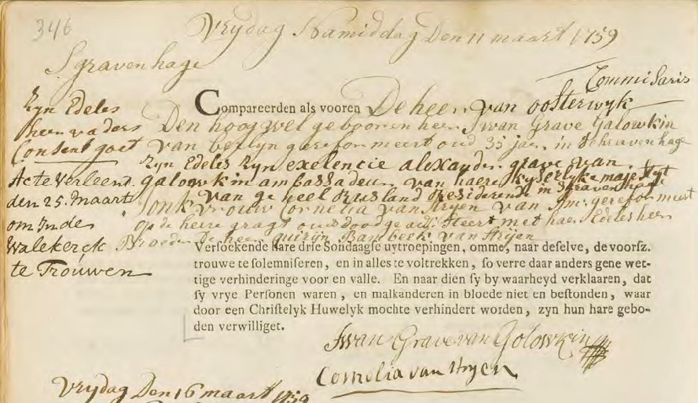 Iwan ondertrouwt Amsterdam 11-03-1759 met Cornelia van STRIJEN, gedoopt Nieuwezijds Kapel, Amsterdam 14-05-1727, overleden en begraven Westerkerkhof, Amsterdam 09-12-1794, dochter van Jacob van STRIJEN en Geertruijd BLAEU.