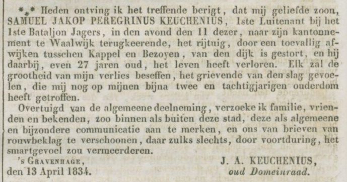 - Samuel Jacob PEREGRINUS KEUCHENIUS, geboren Den Haag 1807, overleden Sprang-Capelle, Den Haag 11-04-1834.