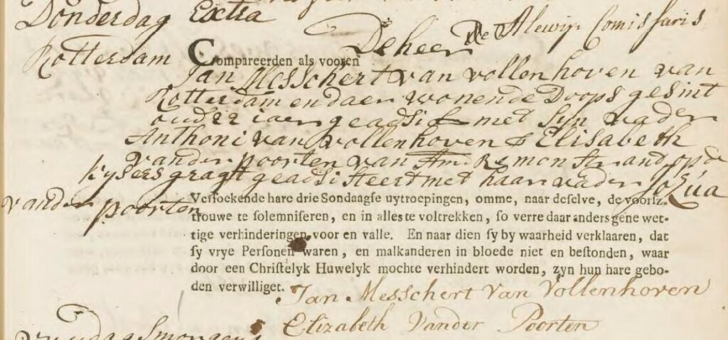 Jan MESSCHERT van VOLLENHOVEN, gedoopt Rotterdam 02-09-1748, overleden Huis de Beek Bloemendaal 05-03-1814, zoon van Anthoni van VOLLENHOVEN en Maria MESSCHERT.