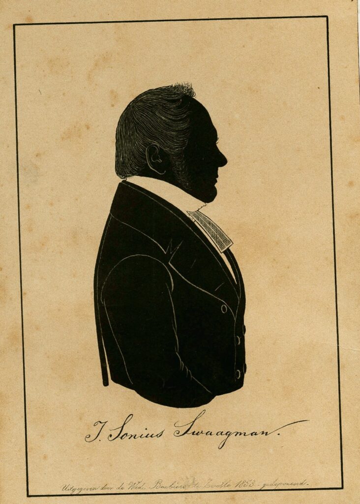 Jan SONIUS SWAAGMAN, geboren Steentilstraat Groningen, gedoopt Groningen 13-07-1805, overleden Groningen 19-06-1858, wonende in Onderdendam, zoon van Popko SWAAGMAN (koopman) en Annegien SONIUS.