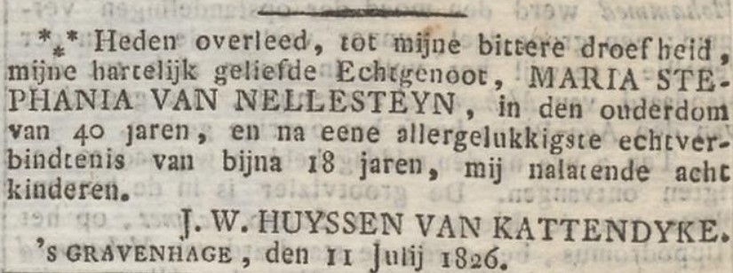 - Maria Stephiana HUIJSSEN van KATTENDIJKE, geboren Den Haag 09-09-1820, overleden Den Haag 12-05-1821.