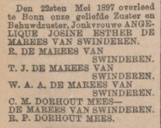 - Angelique Josine Esther de MAREES van SWINDEREN, geboren 06-07-1855, overleden Bonn 22-05-1897.