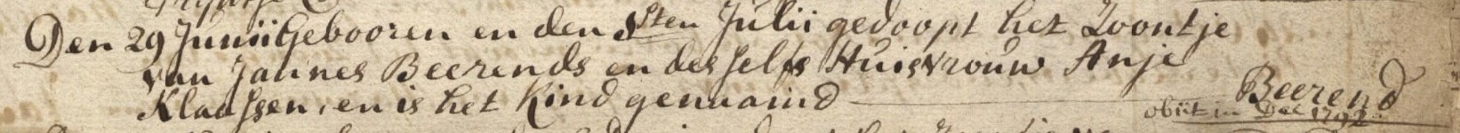 - Berend WIERSUM, geboren 29-06-1792, gedoopt (als Beerend) Menkeweer 01-06-1792, overleden december 1792.