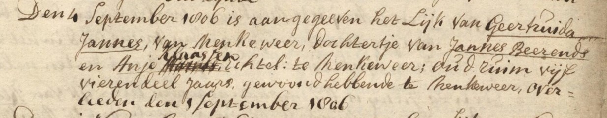 - Geertruida Jannes WIERSUM, geboren op Roowolt 14-05-1805, gedoopt Menkeweer 03-06-1805, overleden Menkeweer 01-09-1806, begraven Menkeweer 04-09-1806.
