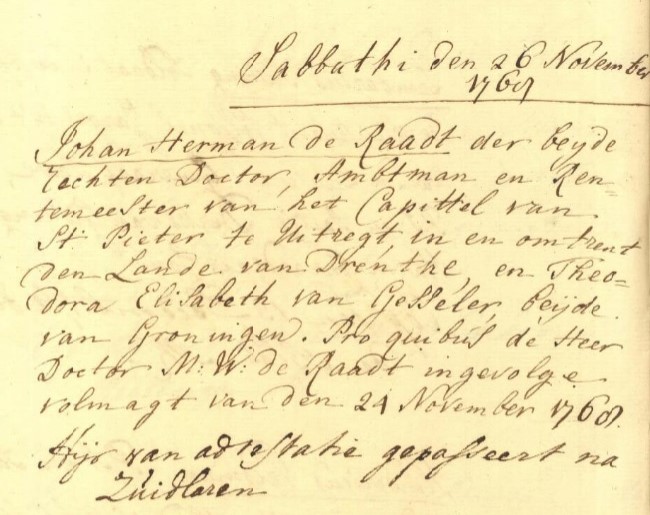Johan is getrouwd Groningen 26-11-1768 met Theodora Elizabeth van GESSELER, dochter van Jacob van GESSELER en Anna Cornelia Maria NIJSING.