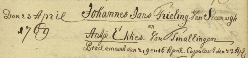 Johannes Jans FRIELING, gedoopt Steenwijk 22-10-1730, overleden Tinallinge 02-12-1804, zoon van Jan FRIELING en Hendrina de GROOT.