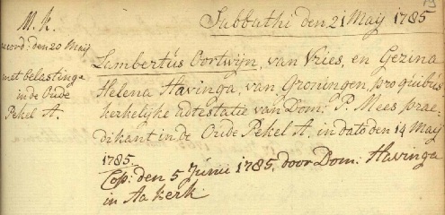 Lambert is ondertrouwd Martinikerk Groningen 21-05-1785 en getrouwd Der Aa-kerk Groningen 05-06-1785 met Gesina Helena HAVINGA, geboren Groningen 03-09-1785, overleden Groningen 20-11-1835, dochter van Scholto HAVINGA en Harmanna PIJPERS.