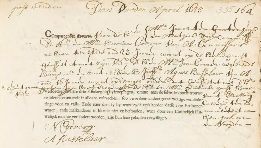 Nicolaas CORVER, gedoopt (als Nicolaes) Oude Kerk Amsterdam 20-10-1661, overleden Amsterdam 17-02-1692, zoon van Joan CORVER en Margaretha van BAMBEECK.