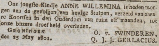 2. Anne Willemina van SWINDEREN, geboren Martinikerkhof Groningen 24-06-1800, gedoopt Martinikerk Groningen 04-07-1800, overleden Groningen 25-05-1801.