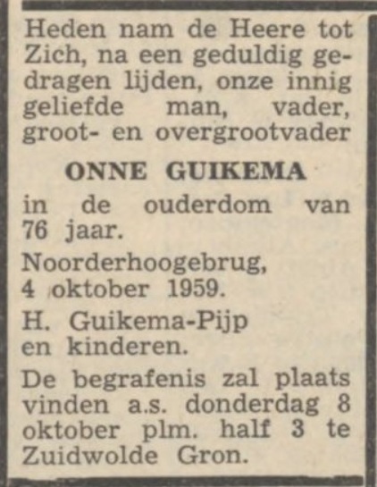 Onne GUIKEMA, geboren Noorderhoogebrug (Bedum) 22-09-1883, overleden Noorderhoogebrug 04-10-1959, zoon van Gerrit GUIKEMA en Jantje KREMER.