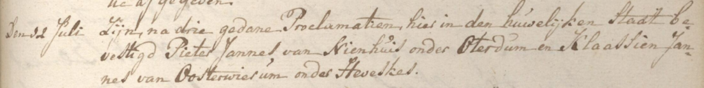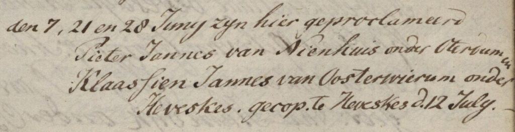 Pieter is getrouwd Heveskes 12-07-1807 met Klaassien Jannes TOXOPEUS, geboren Klooster Oosterwierum (onder Heveskes) 21-11-1789, overleden (tijdens de geboorte van een kind) Oterdum 06-01-1822, dochter van Jannes Lambartus TOXOPEUS en Martje Klasen.