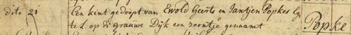 Popke is getrouwd Westerwijtwerd 13-12-1800 met Anje Alberts WESTERHOF, geboren Westerwijtwerd 1778, overleden Middelstum 20-03-1835, dochter van Albert Hilbrands en Bouke Tomas.