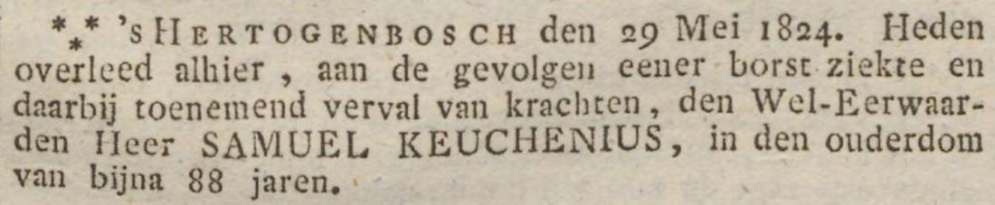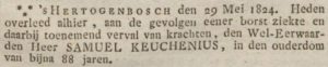 Samuel KEUCHENIUS, gedoopt (als Zamuel) Hilvarenbeek 14-07-1737, overleden Den Bosch 29-05-1824, zoon van Paulus KEUCHENIUS en Emilia Eusebia NEOMAGUS.