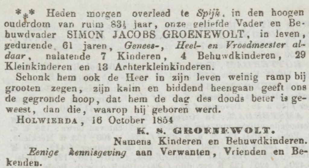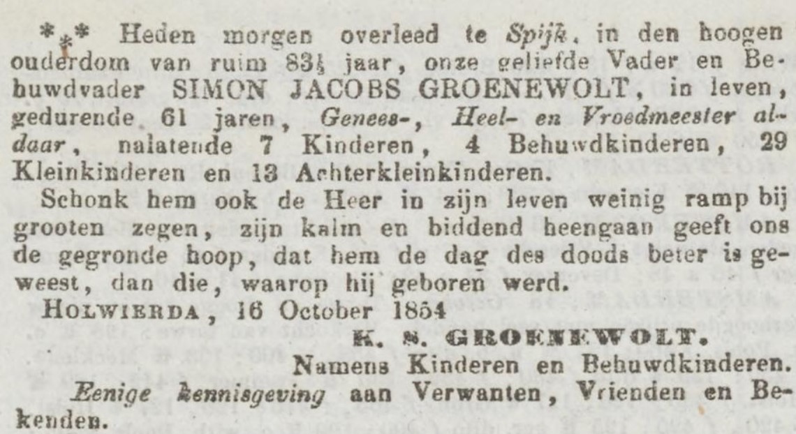 Simon Jacobs GROENEWOLT, (ook Groenewold), gedoopt Zuidwolde (Bedum) 21-04-1771, overleden Spijk 16-10-1854, zoon van Jakob Hiwes GROENEWOLT en Anje Jakobs van DIJK.