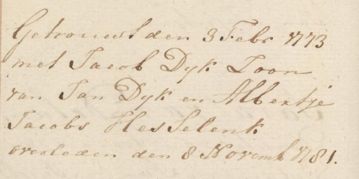 Steven DIJK, gedoopt Groningen 26-06-1747, overleden Hengelo 23-02-1839, zoon van Jan DIJK en Albertje Jacobs HESSELINK.