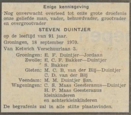 Steven DUINTJER, geboren Wildervank 23-08-1879, overleden van Ketwich Verschuurlaan 3, Groningen 17-09-1970, zoon van Marcus Marinus DUINTJER en Catharina Henderika MEIHUIZEN.