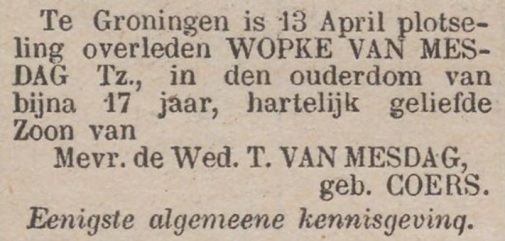 1. Wopke van MESDAG, geboren Hees (Nijmegen) 30-04-1866, overleden Groningen 14-04-1883.
