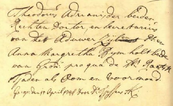 Theodorus ADRIANI, geboren Herestraat Groningen, gedoopt Martinikerk Groningen 14-03-1713, overleden Groningen 08-04-1796, zoon van Arius ADRIANI en Johanna Margreta MEIJNTJES.